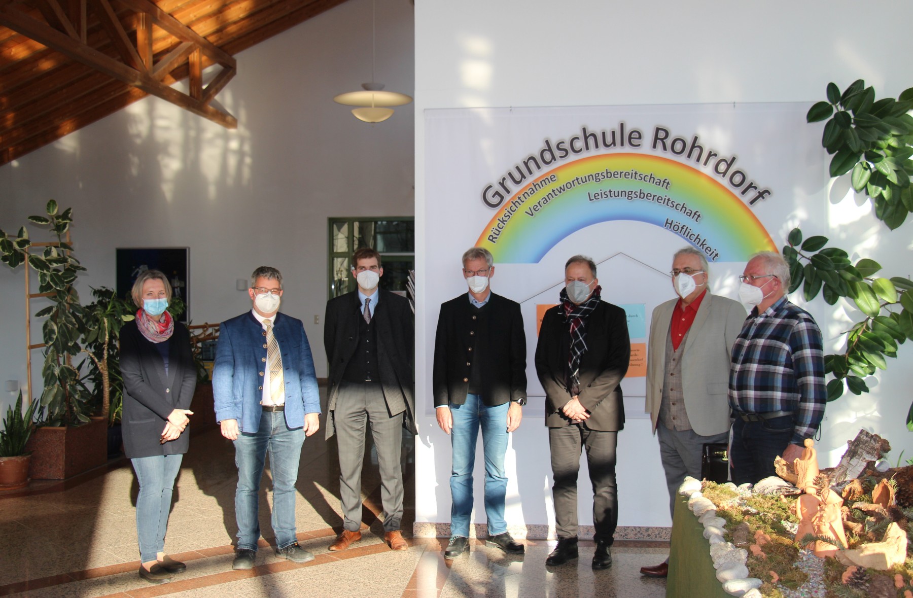 Grundschulrektorin B. Irle, die Bürgermeister S. Lederwascher (Flintsbach), S. Hausstetter (Rohrdorf), M. Jokisch (Brannenburg), A. Demmer (CGC), A. Zender (Winco GmbH), B. Frommelt (CGC)