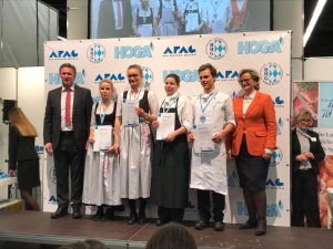 von links nach rechts: Gernot Raab, Schulleiter der Berufsschule München Hans Schneider, Vorsitzender der Berufsbildung des Dehoga Bayern, Andrea Nadles, Fachlehrerin Berufsschule München & Präsidentin des VSR, Anna Albrecht, Vizemeisterin bei den Hotelfachleuten, Erhard-Josef Hans, Fachlehrer Berufsschule München, Angela Inselkammer, Präsidentin des Dehoga Bayern
