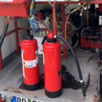 – Die verschiedenen Feuerlöscher mit Wasser oder CO2 gefüllt