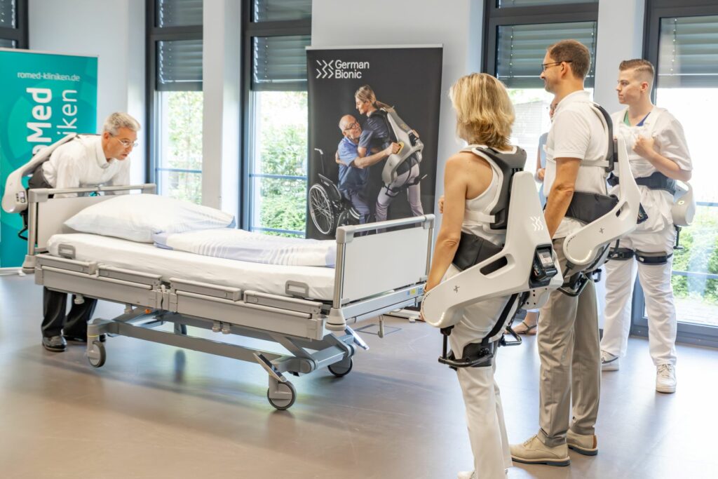 Die RoMed Kliniken haben sich auch deshalb dazu entschlossen eine zukunftsweisende Partnerschaft mit dem Berliner Robotik-Unternehmen German Bionic einzugehen, um die Arbeitsbedingungen im Pflegeberuf sicherer, gesünder und nachhaltiger zu gestalten. Zukünftig werden die aktiven, vernetzten und KI-unterstützten Exoskelette Apogee+ eingesetzt, die speziell dafür entwickelt wurden, Pflegepersonal im Arbeitsalltag dynamisch zu unterstützen. „Die Ausstattung mit hochmodernen Exoskeletten soll dazu beitragen, dass unsere Pflegekräfte, die ja einen entscheidenden Beitrag zur Qualität unserer Kliniken leisten, körperlich weniger belastet werden und sich so mehr auf das fokussieren können, wofür sie ihren Beruf schätzen – die Nähe zu und den Umgang mit Menschen“, erklärt Judith Hantl-Merget, Pflegedirektorin und Prokuristin der RoMed Kliniken.