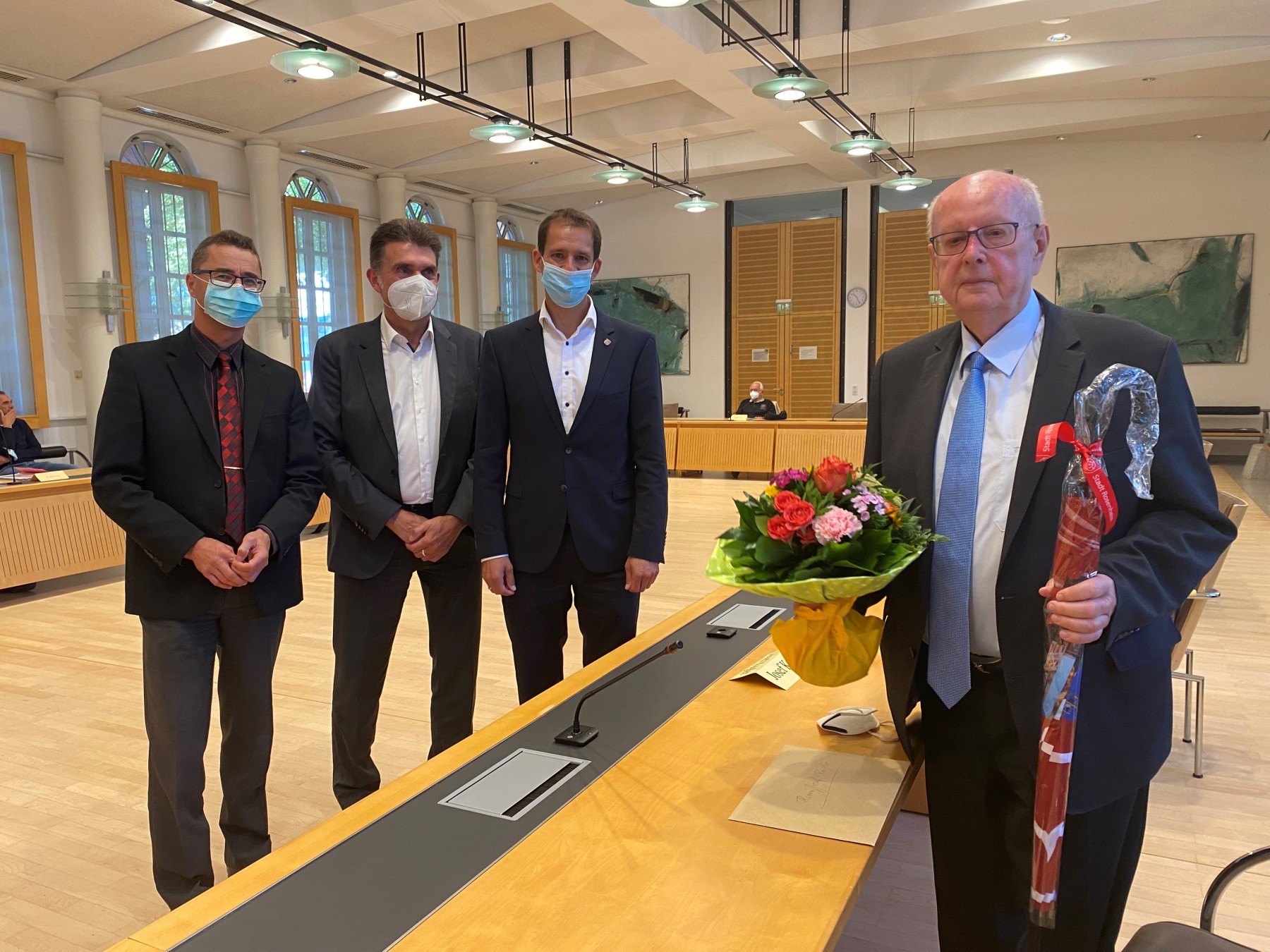 (vlnr.): Oberbürgermeister Andreas März, Stadtdirektor Michael Keneder und Sachgebietsleiter Wolfgang Klupp mit dem scheidenden Vorsitzenden Josef Kugler