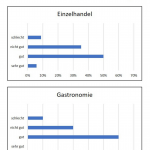 Mit der Aufhebung des Shutdowns erholt sich die wirtschaftliche Situation der meisten befragten Unternehmen langsam wieder. Grund für die aktuelle positive Entwicklung waren zum einen die Hilfen von Bund bzw. Land, die von 75 % der Einzelhändler und 90% Gastronomen in Anspruch genommen wurden. Auch die Maßnahmen auf lokaler Ebene durch das City-Management fanden einen breiten Zuspruch. Als hilfreich wurden vor allem das regelmäßige Informationsrundmail, die Öffentlichkeitsarbeit, die kostenfreien Erweiterungen der Außenflächen und die Aufstellung der Online-Lieferdienste benannt. Die Mehrheit der Betriebe beurteilten die Unterstützungsmaßnahmen der Stadt als gut. Darunter wurden vor allem die Maßnahmenaktion „Sommer in Rosenheim“ und die Stadtmöblierungsaktion „Nimm Platz“ als hilfreich bewertet. Die Befragten gaben an, ihr Warenangebot weiterhin besser in den sozialen Medien präsentieren und die eigene Website attraktiver gestalten zu wollen. Etliche Betriebe setzen zudem auch zukünftig einen Fokus auf guten Beratungsservice per Telefon, Whatsapp oder Video und die Möglichkeit individuelle Beratungstermine auszumachen. Zudem wollen einige Betriebe durch Onlineshops, Lieferservice bzw. Essen „to-go“ ihre Kundenbindung weiter ausbauen.