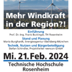 Unter dem Titel „Mehr Windkraft in der Region ?!“ findet die nächste Info-Veranstaltung der Initiative „Rosenheimer Energiedialoge“ am Mittwoch, 21.02.2024 in der Technischen Hochschule (TH) Rosenheim statt. Die Vorträge starten um 19 Uhr im Raum E0.01. Ab 18 Uhr kann man eine Ausstellung im Foyer besichtigen. Alle interessierten Bürgerinnen und Bürger sind eingeladen, der Eintritt ist frei.