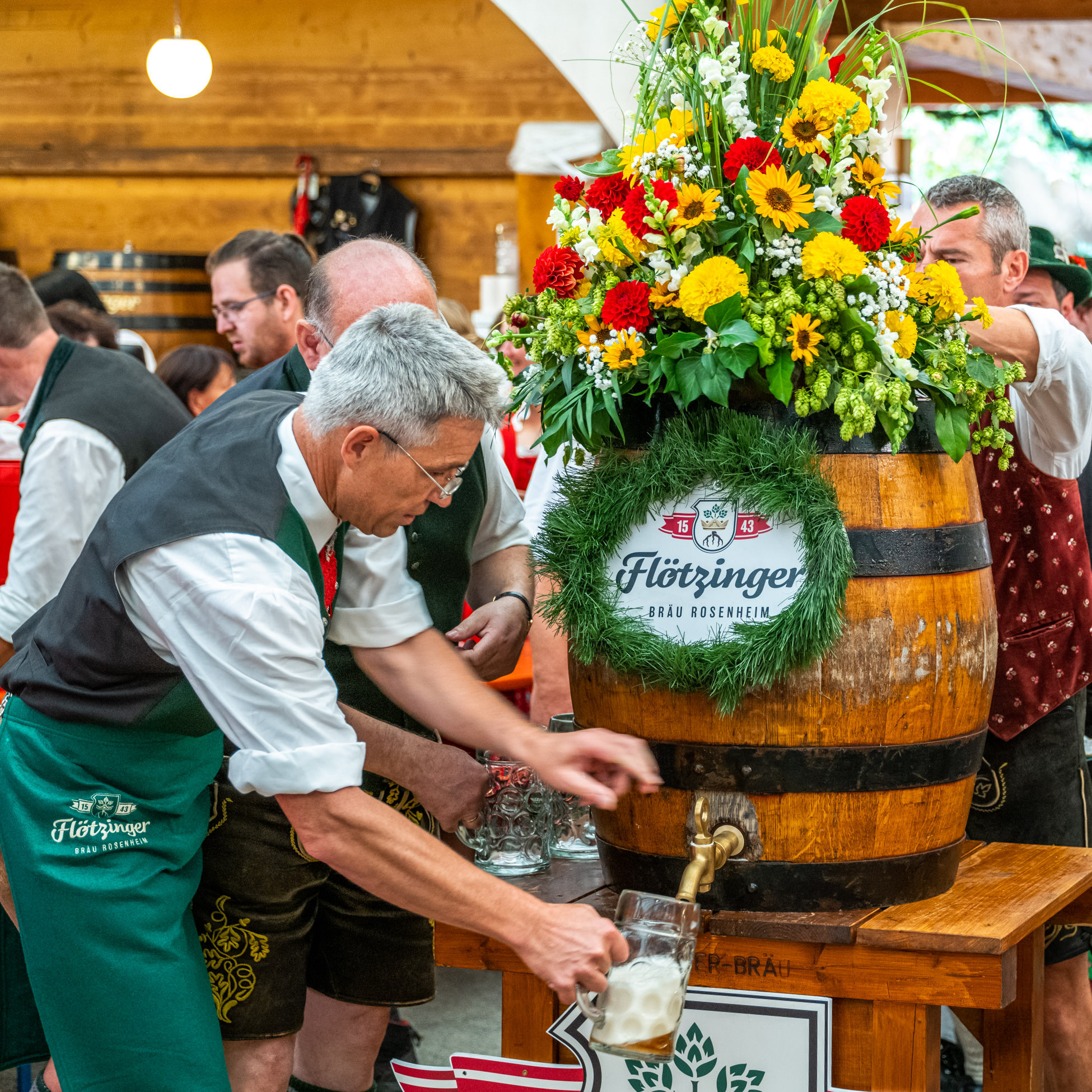 Zapf-Debütant, Landrat Otto Lederer zapft das erste Faß Bier an (in der Flötzinger Halle)