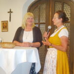 Mit einem kurzweiligen Motivations-Vortrag machte die Stellvertreterin von Landesbäuerin Christine Singer, Christine Reitelshöfer aus Mittelfranken den anwesenden Bäuerinnen und Landfrauen Mut, mehr zu wagen. Besonders in der öffentlichen Diskussion und in der Politik sollen sich die Frauen mehr Gehör verschaffen. Dazu gehört es auch, dass sich Frauen in der Haus- und Landwirtschaft fachkundig ausbilden lassen. „75 Jahre in Bayern organisierte Landfrauen sind 75 Jahre Bildungsarbeit, Gesundheitsvorsorge und Brauchtumspflege“ – so die Referentin, die auch auf zukünftig stärker werdende Themen die Ernährung und die Pflege sein werden. Zusammenfassend zum Appell des Sich-Mehr-Einmischens zitierte die Rednerin: „Wenn immer der Klügere nachgibt, dann bestimmen zum Schluss die Deppen wo es langgeht“. Mit einem RegRo-Genusskorb und mit regionalen Schmankerln bedankten sich die Gastgeber bei Christine Reitelshöfer. Eingeladen wurde noch namens der Landesehrenbäuerin Annemarie Biechl zu einem Benefizkonzert am Sonntag, 25. Juni um 15 Uhr im Kloster Frauenwörth zugunsten des dortigen Freundeskreises und Klosters. Blumen gab es abschließend noch für Anneliese Riepertinger und für ihre Dienste bei der Seniorenbetreuung und ein Vergelt´s Gott gab es noch für meine Volksbank-Raiffeisenbank für die Einladung zu Kaffee und Kuchen. Auch ein nachmittäglicher Handwerkermarkt bereicherte den arbeitsfreien Tag der Bäuerinnen und Landfrauen (über die Ehrungen berichten wir noch gesondert).