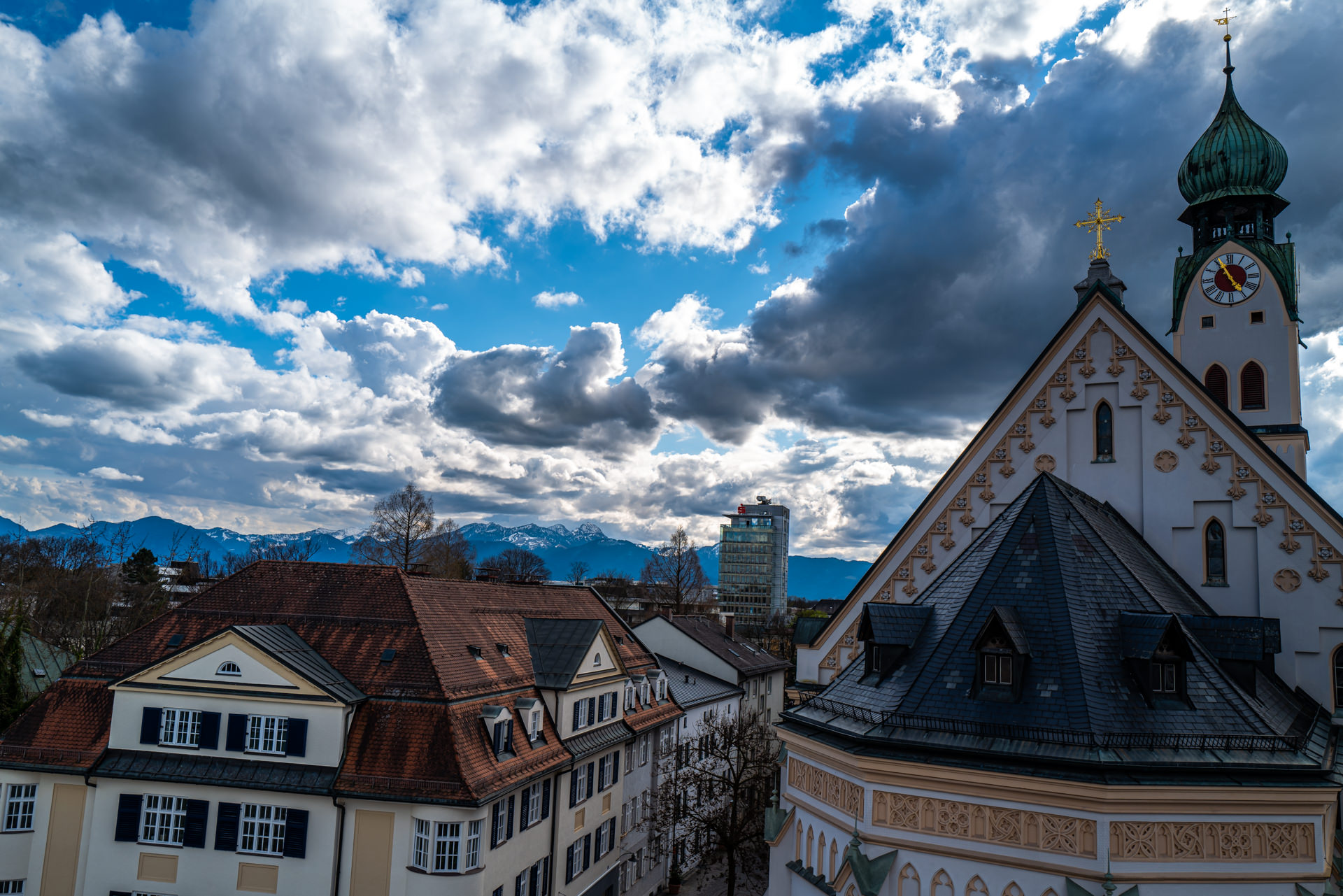 Blick vorbei an der Stadtpfarrkirche St. Nikolaus in Richtung Wendelstein, aus der Gondel des Riesenrads am Ludwigsplatz