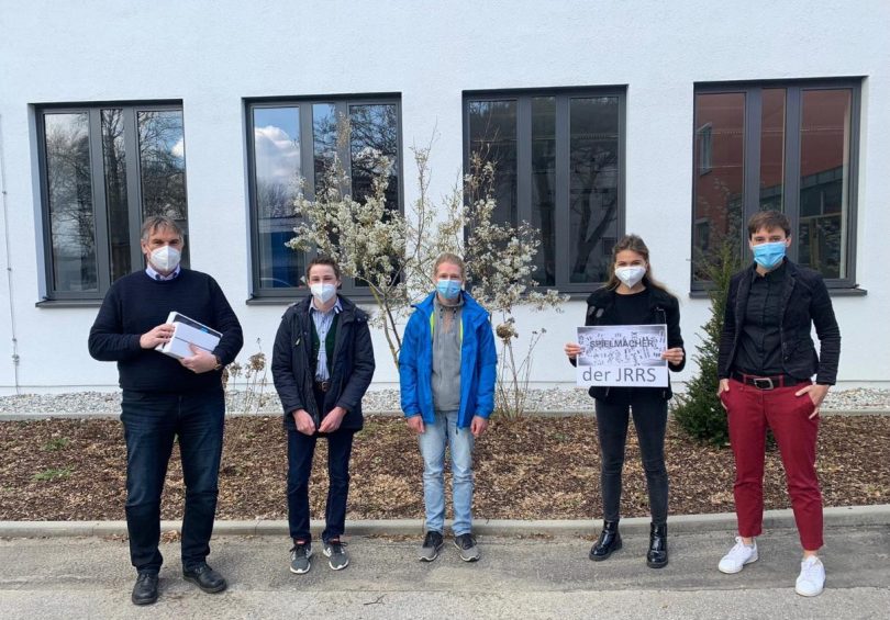 Bildunterschrift: Die Initiatorinnen des Schulprojekts „Spielmacher“ der Johann-Rieder-Realschule Rosenheim (von rechts): Christina Dörner, Johanna Daxeder. Schirmherr des Projekts Schulleiter Wolfgang Forstner mit den Gewinnern des ersten und zweiten Preises (von links).