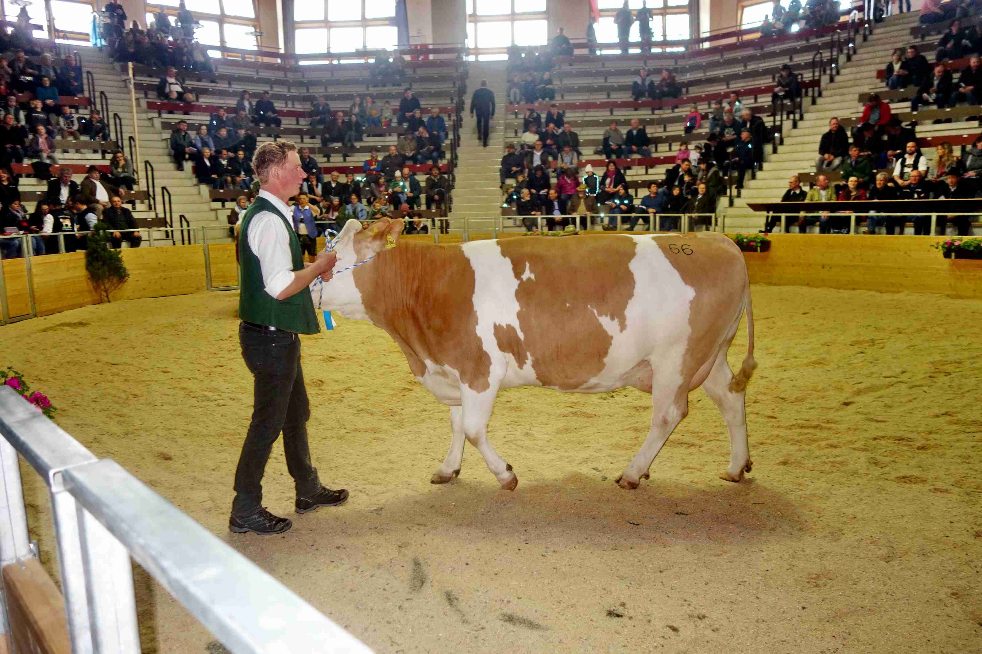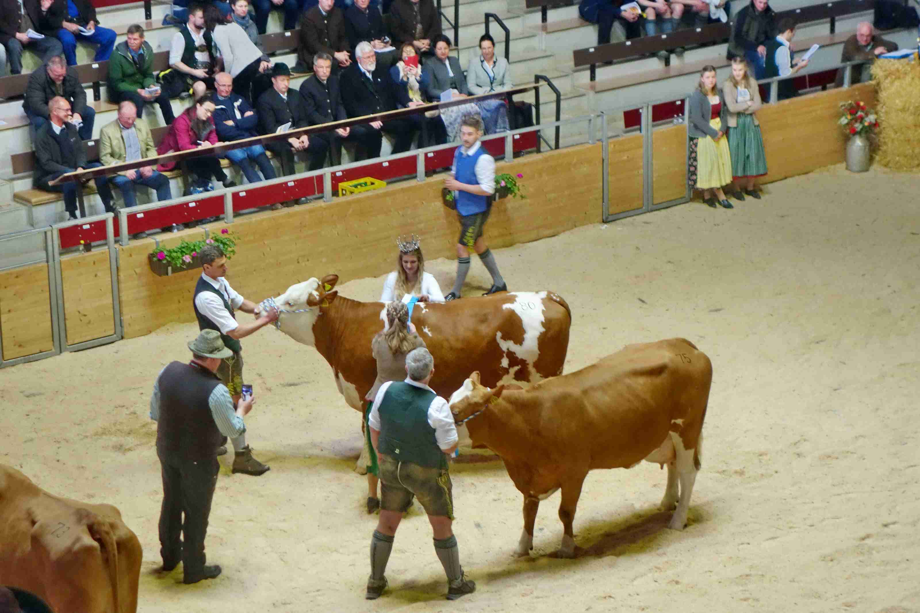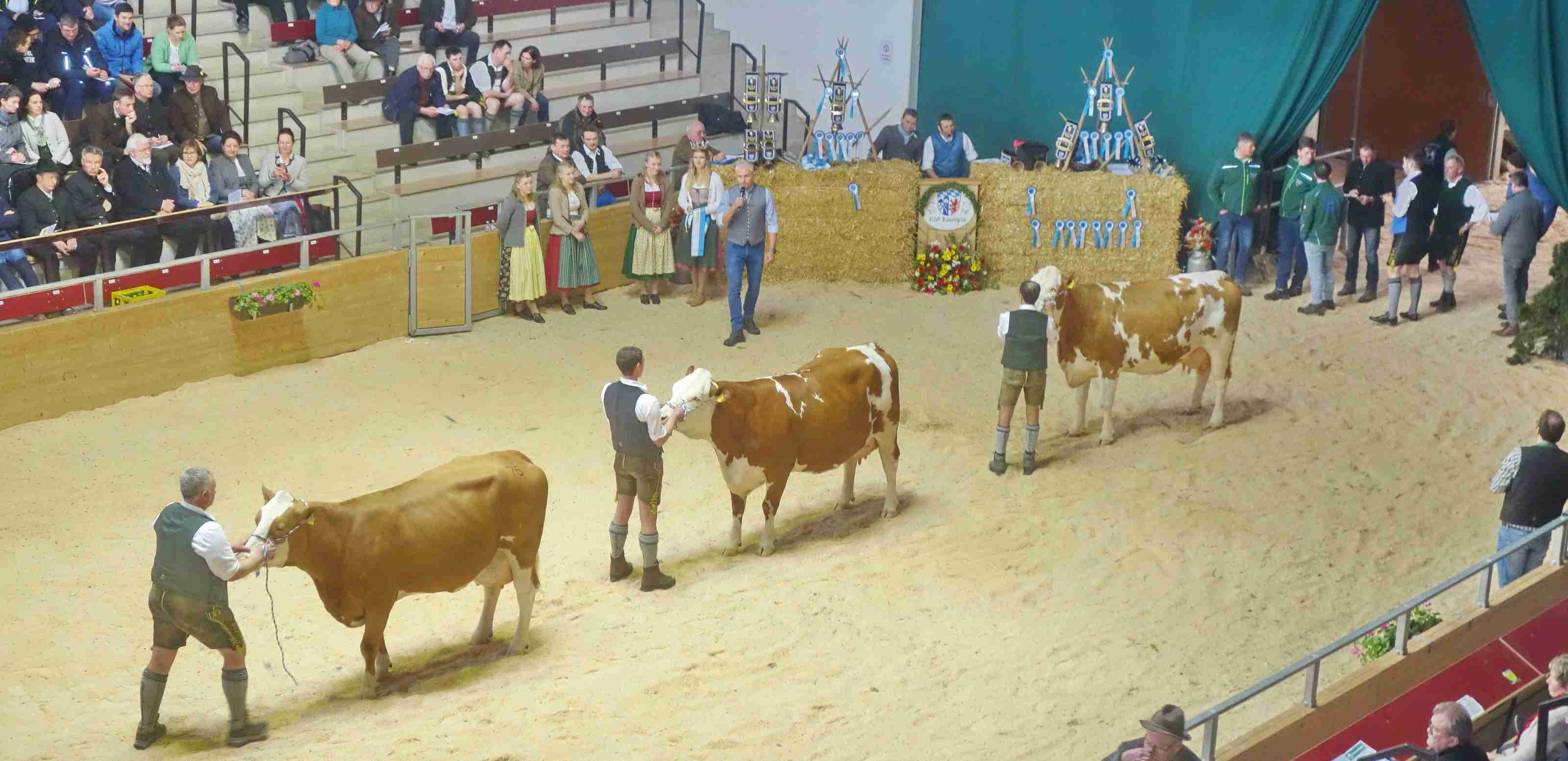 Weiters sagte der Landrat und Schirmherr der Tierschau, die die VZG Rosenheim alle zehn Jahre veranstaltet, dass er froh ist um den täglichen Arbeitsfleiß der bäuerlichen Familien und um die vielen aktiven, zum Teil über einhundert Jahre alten landwirtschaftlichen Organisationen wie die Viehzuchtgenossenschaft. Einen nachdenklichen Ton schlug er an als er auf das Thema Wolf einging, dazu sagte er: „Tierwohl und Tiergesundheit werden in den Ställen und auf den Feldern der VZG-Mitglieder mit Herzblut gepflegt, da tut es nur weh, wenn man auf die Hilflosigkeit der Politik schaut bei deren Umgang mit dem Beutegreifer Wolf“. Der Landrat war ebenso sie Bezirksrat Sebastian Friesinger sowie viele Vertreter von bäuerlichen Organisationen (Bauernverband, Maschinenring u.a.m.) sowie von Firmen und Verbänden, die eng mit der Landwirtschaft verbunden sind, Ehrengast und Augenzeuge, mit welcher Liebe und Pflege die Bauern und Züchter ihre Tiere auf die Zuschau-Stellung und auf den Wettbewerb vorbereitet hatten. In vielen verschiedenen Klassen wurden die Kühe nach vielerlei Kriterien bewertet, Preisrichter war dabei Ernst Grabner aus Niederösterreich. Die Leitung bei der Staatlichen Tierschau lag in den Händen von Dr. Rudolf Maierhofer vom Amt für Landwirtschaft, Ernährung und Forsten in Holzkirchen sowie von Markus Dinzenhofer, dem Vorsitzenden der VZG Rosenheim. Moderator der kurzweiligen Präsentationen und Ehrungen war Florian Maier aus Rottach-Egern. Waren am Vormittag die milchleistenden Kühe im Mittelpunkt galt am Nachmittag die Aufmerksamkeit dem züchterischen Nachwuchs, unter anderem bei einem Bambini-Cup der Jungzüchter Rosenheim.