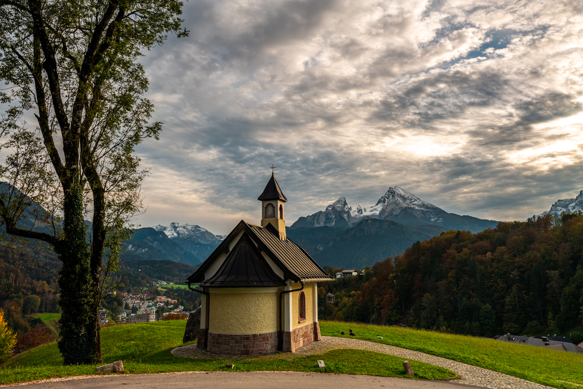 Die Kirchleitnkapelle auf dem Ponnzenzenbichl in Berchtesgarden mit Blick auf den Watzmann