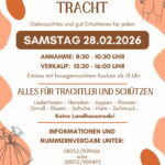 Besucherinnen und Besucher erwartet ein umfangreiches Angebot an gebrauchter und gut erhaltener Trachtenkleidung für Damen, Herren und Kinder. Zum Verkauf stehen unter anderem Lederhosen, Dirndl, Hemden, Joppen, Blusen, Schuhe, Hüte, Ranzen und Schmuck. Der Markt richtet sich gezielt an Trachtler und Schützen; Landhausmode wird nicht angeboten. Die Annahme der mit Verkaufsnummern fertig ausgezeichneter Waren erfolgt von 8:30 bis 10:30 Uhr, der Verkauf ist von 13:30 bis 16:00 Uhr geöffnet. Wer einen hausgemachten Kuchen mitbringt, kann bereits ab 13 Uhr stöbern.