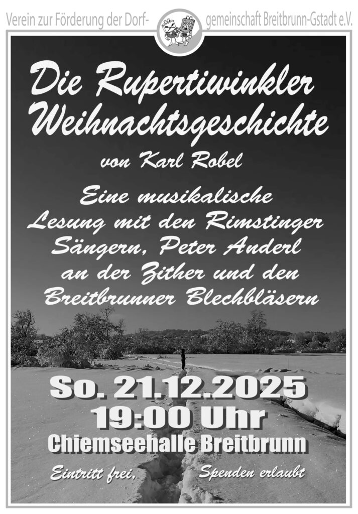 Lektoren sind Hans Obermeier, Hartmut Distler, Monika und Paul Vodermair. Die Chiemseehalle wird weihnachtlich geschmückt, es gibt Plätzchen und Glühwein und so werden wir die Besucher feierlich auf das Weihnachtsfest einstimmen.