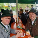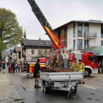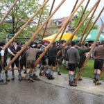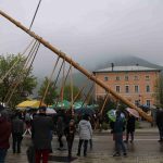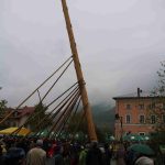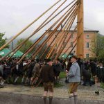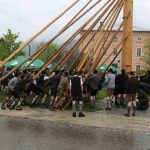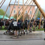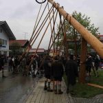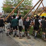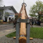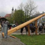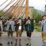 Er ist wieder da: der neue Maibaum am alten Standort am Hans-Clarin-Platz. Die Sachranger waren es, sie hatten den Aschauer Maibaum seit dem Jahresbeginn im Gewahrsam. Fast 70 Männer der drei Trachtenvereine „Griabinga“ Hohenaschau, „Edelweißer“ Niederaschau und „Geiglstoana“ Sachrang stellten den über drei Tonnen schweren, 35 Meter langen Maibaum an seinem Platz vor dem Aschauer Bahnhof auf. Über zwei Stunden harte Arbeit, unter der Leitung von Rudolf Angermaier war notwendig, um den Baumriesen fest in seiner neuen stabilen Halterung zu verankern. Bürgermeister Simon Frank führte die Verhandlungen mit den Maibaumdieben. Für eine Maß Bier und eine Brotzeit waren sie nach der Verhandlung schließlich bereit, den Baum wieder herzugeben und beim Aufstellen mitzuhelfen. Das drohende schlechte Wetter beschleunigte die schwere Arbeit erheblich: beinahe in Rekordzeit brachten die Männer den Baum – gesichert durch einen Autokran – in die Senkrechte und die neuen Maibaumfiguren, gestaltet und bemalt von Alraune und Christian Huba, wurden mit der Drehleiter angebracht. Danach ließen sich alle miteinander das hart verdiente Bier und die Brotzeit schmecken.