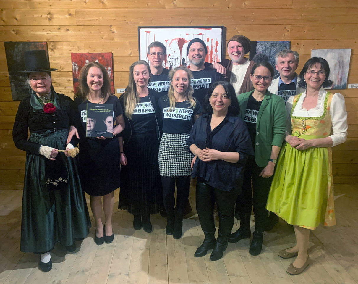 Vernissage am 14.4.23 im Kammerlanderstall in Neukirchen/Gr.Ven.: Vorne v. li. Buch-Cover-Model Ingrid Lausenhammer aus Lofer mit Tracht, Autorin Christine Schweinöster mit Buch; ihre Töchter Iris und Silvia (Projekt „#empoweredWeiberleit“); Malerin Vesna Divkovic aus Mittersill, die ebenfalls ihre Bilder ausgestellt hat; LH-Stellvertreterin Martina Berthold; TAURISKA-Geschäftsführerin Susanna Vötter-Dankl