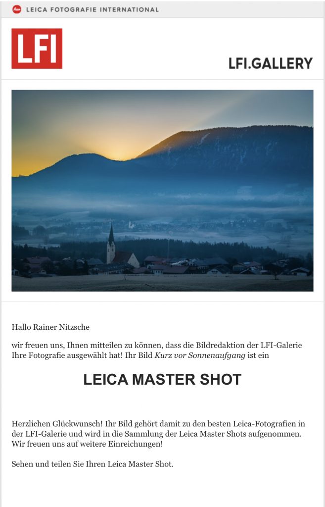 Das Foto zählt damit zu den besten Leica-Fotografien in der LFI-Galerie und wird in die Sammlung der Leica Master Shots aufgenommen. Das Foto entstand wenige Augenblicke vor Sonnenaufgang auf dem Samerberg. Es zeigt den Blick über Törwang nach Grainbach und zum Riesenberg wenige Augenblicke vor Sonnenaufgang.