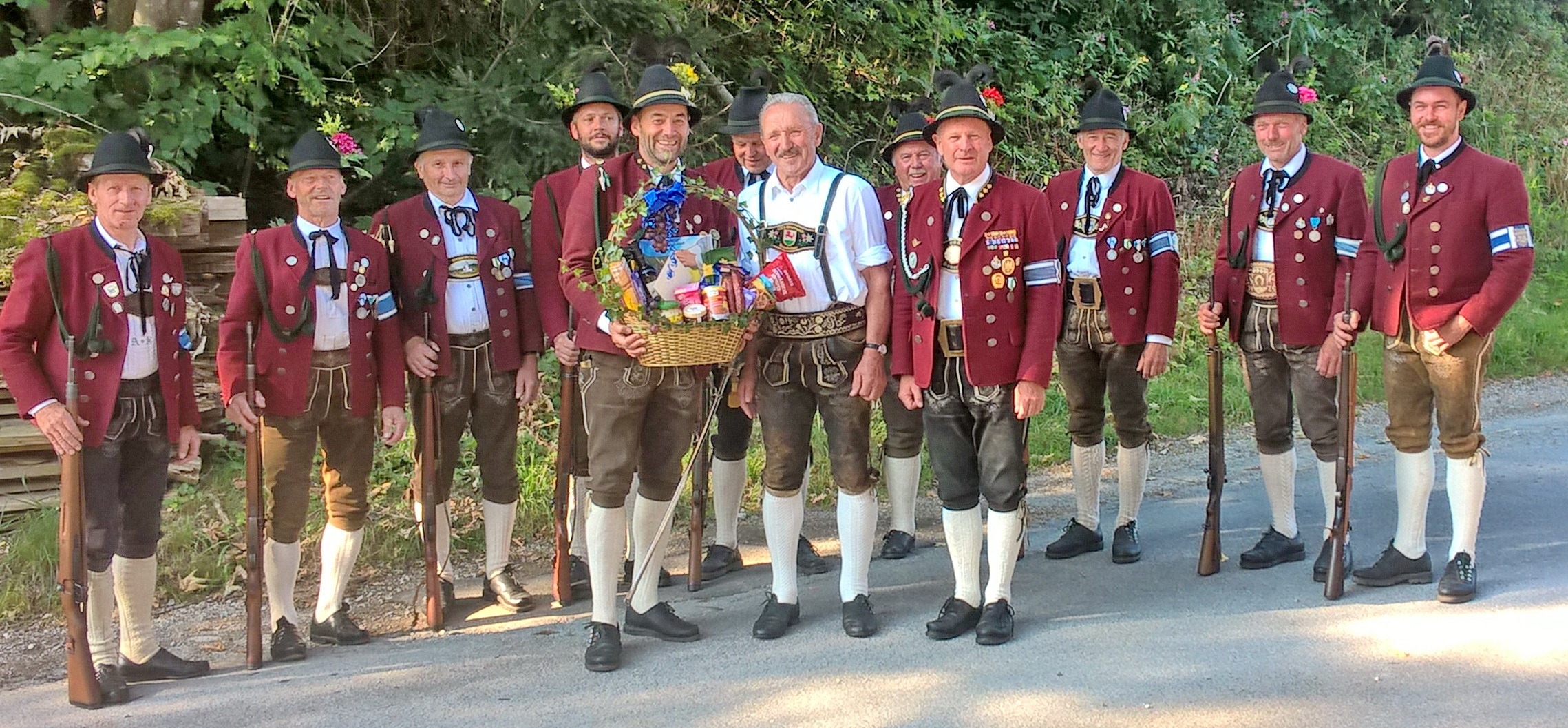 Christian Irger (Mitte-links) und Hauptmann Fritz Dräxl (Mitte-rechts) überreichten Josef Uhl zu seinem 70. Geburtstag einen Geschenkkorb