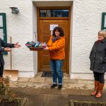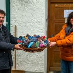 Foto: Hötzelsperger – Diakon Günter Schmitzberger (li.) empfängt von Barbara Huber und Gisela Schober (re.) einen Korb farbenfroher und warm-machender Socken für die weihnachtlichen Besuche bei Samerberger Seniorinnen und Senioren.