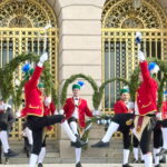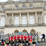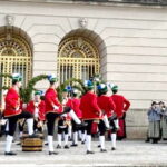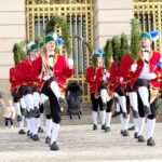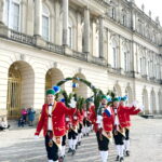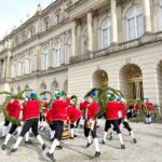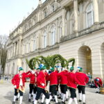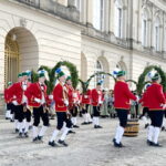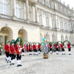 Fotos: Eindrücke von den Auftritten der Schäffler mit der Musikkapelle Kirchheim vor dem Königsschloss, u.a. Gruppenbild (dabei steht Vorstand Franz Sepp hinter dem Fass).