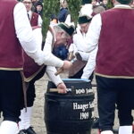 Mit ihrem aus verschiedenen Figuren bestehenden Tanz, die mit den in Buchs eingebundenen Bögen gebildet werden, verbreiteten sie dem Sinn des Brauchtums entsprechend Lebensfreude und Zuversicht. Gekonnt balancierten die Reifenschwinger mit rasantem Schwung ein volles Schnapsglas und im Takt der Musik wurden von zwei Schäfflern die Reifen auf ein Fass geschlagen. Nach dem Schäfflertanz waren die Besucher leicht an ihren von den Spaßmachern gefärbten Nasen zu erkennen. Die Leonhardischützen Thambach, die Jägerschützen Tiefenstätt-Ramsau und der Trachtenverein Reichertsheim, inzwischen alle drei auch „Thambacher Ortsvereine“ hatten eingeladen und, wie von den Schäfflern zu vernehmen war, damit einen der besucherstärksten Auftritte der Haager Schäffler organisiert. Gut angenommen wurde von den Gästen auch die Bewirtung im Thambacher Schützenheim.