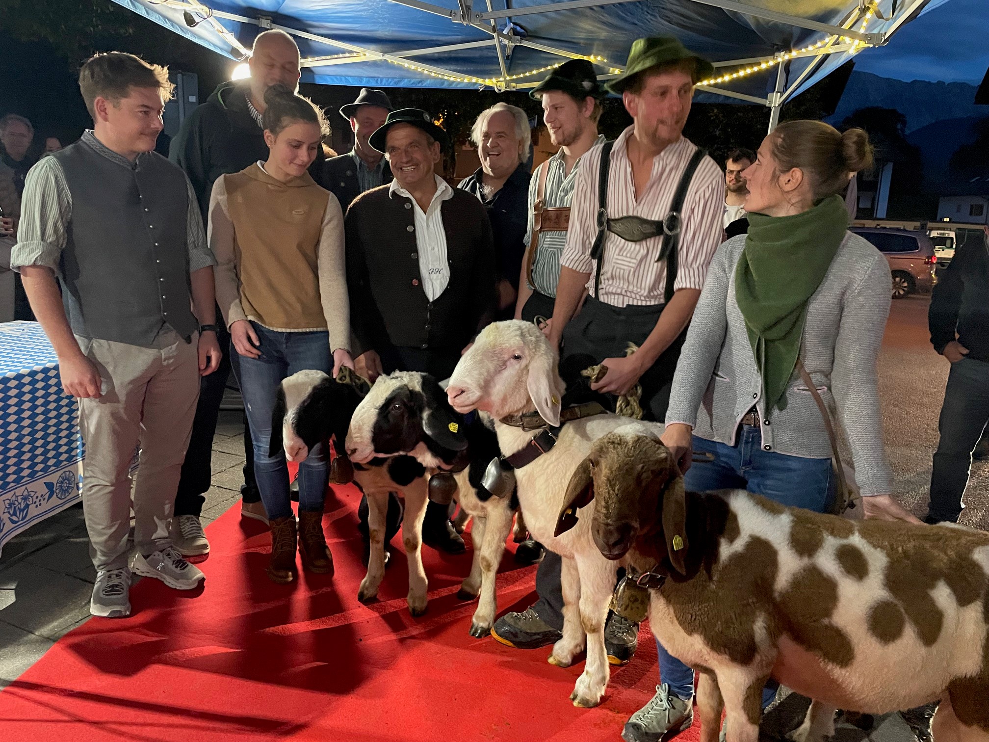 Schafe auf dem roten Teppich. Die Schafe Bruno, Oskar, Leo und Prinz wurden bei der Kinopremiere von SCHAFSTAGE vor dem Hochlandkino in Garmisch-Partenkirchen begeistert gefeiert. Mit auf dem Bild, Florian und Peppi Hornsteiner, Schafhalter Franz Strotz sowie die Regisseure Klaus-Peter Hütt und Walter Steffen. Foto: ©Maren Martell