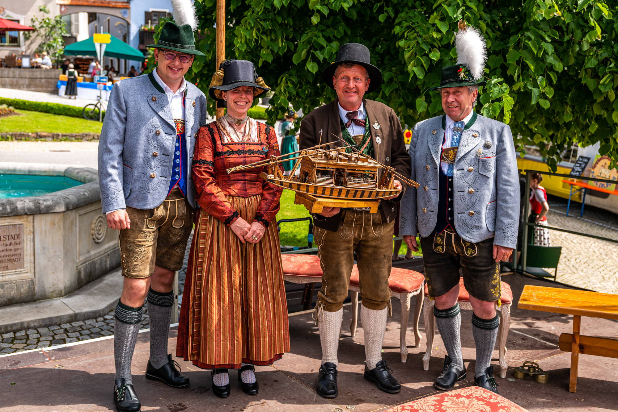 400 Jahre Neubeurer Schiffleutbruderschaft – Festsonntag: Bürgermeister Christoph Schneider (li.) und Zweiter Bürgermeister Wolfgang Sattelberger (re.) überreichten den Vereinschefs Juliane Tiefenmooser und Georg Wachinger das Modell eines Schiffs für das Museum.