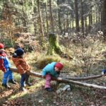 Aber es gibt auch die „Goldenen Waldregeln“, die müssen von allen Kindern eingehalten werden. Es sind klare Regeln mit sinnvollen Konsequenzen, zum Beispiel dürfen die Kinder nicht aus Sicht- und Hörweite gehen, nicht mit spitzen Stöcken aufeinander zulaufen, schnitzen mit dem Messer nur mit einem Erwachsenen zusammen und die mitgebrachte Brotzeit wird grundsätzlich zusammen gegessen.