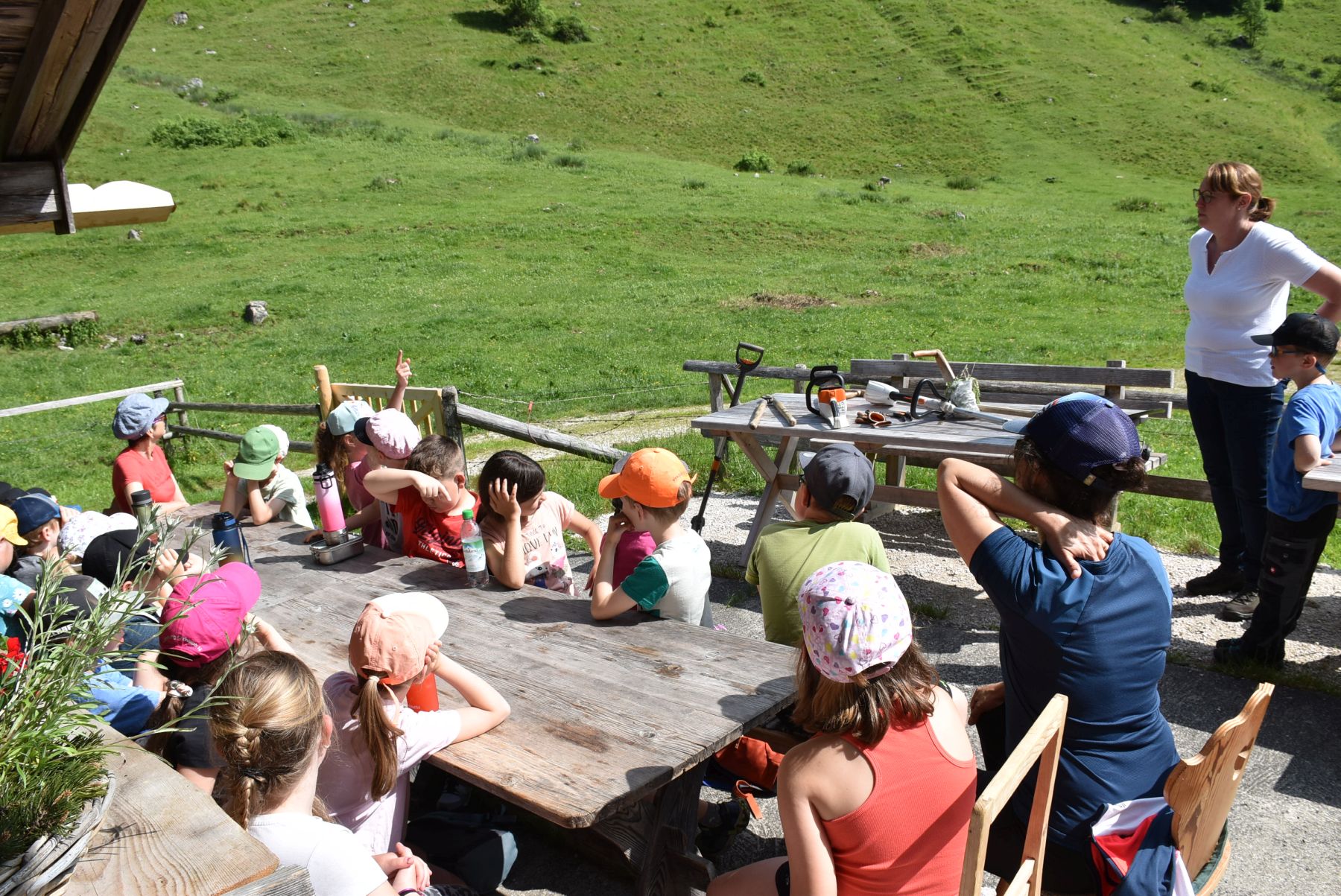 Maria König (rechts stehend) erklärt den Schülern der 1.+2. Klasse die Geräte, die zum schwenden gebraucht werden