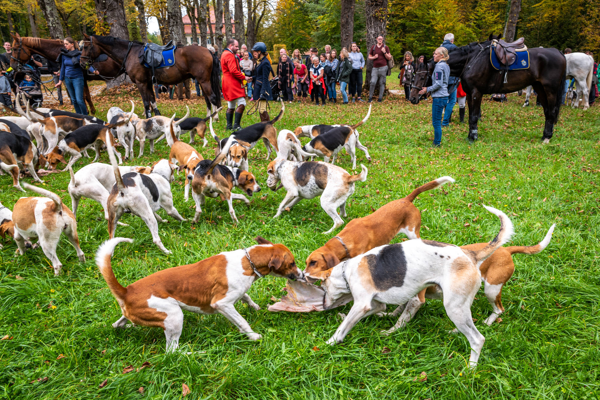 65. traditionelle Schleppjagd auf der Herreninsel 2022: Der Höhepunkt am Ende ist das „Curée“, die Belohnung der Hunde: Die Meute stürzt sich auf den Berg aus müffelndem Pansen.