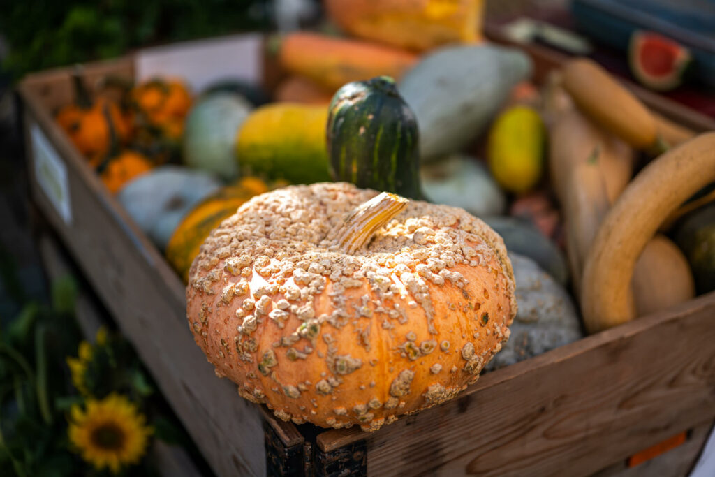 Eine weitere Attraktion war zweifellos die erstaunliche Auswahl an Kürbissen in allen Formen, Größen und Farben. Von winzigen, orange leuchtenden Mini-Kürbissen bis zu riesigen, blassen Kürbissen mit knorrigen Stielen gab es für jeden Geschmack etwas. Einige Kürbisse waren glatt und perfekt geformt, während andere eine rustikale und unregelmäßige Oberfläche hatten, die ihren Charme ausmachte.