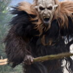 Die Besucher formierten sich in einem Halbkreis, die mutigen Jugendlichen standen ganz vorn und die Kleinen an den Händen der Eltern eher hinten. Hinter der Tür der Scheune schepperte es schon recht laut und weißer Rauch quoll unter dem Tor hervor, da hallten auch schon die Böllerschützen durchs Tal und das Tor flog auf. Die grauslich aussehenden Gestalten stürzten heraus. Die Gesichter waren verdeckt mit Masken aus Fell oder Holz mit großen Hörnern. Gewandet waren sie Ziegen, Reh- oder Hirsch und Schaffelle. Um die Hüften trugen die Gestalten große lärmende Glocken, die einen Höllenlärm machten. In den Händen hielten die Krampein Ruten, die aus Weiden in besonderem Zopfmuster geflochten werden und Respekt verschaffen. Ab und zu -bei allzu dreisten Jugendlichen- wurde die Rute schon mal gebraucht. Mit ihren rußigen Fingern verteilten sie bei groß und klein schwarze Zeichen auf den Gesichtern.