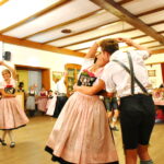 Visuelle und akustische Höhepunkte waren die Auftritte der Goaßlschnalzer, eine ebenfalls perfekt aufeinander abgestimmte Performance, die nur etwas ausgebremst wurde durch die zu tief hängenden Lampen im Saal. Aber mit einem Positionswechsel klappte die alte Fuhrmannstradition. Mit Geschick und Muskelkraft konnten zur Musik passende präzise Töne erzeugt werden. Die Jugendgruppe tanzte das „Mühlradl“, wobei der Vortänzer jeden Figurenwechsel durch Stampfen anzeigt. Das Klappern des Mühlrades wird durch abwechselnden Takt mit Sohle und Ferse des rechten beziehungsweise linken Fußes mit je zweimal auf den Boden klopfen nachgeahmt. Der Figurenwechsel ging rasch und klappte perfekt. Der „Steirer“ wurde von den „Aktiven“ getanzt, es machte den Eindruck, dass dieser Tanz besonders beliebt bei den Ausführenden ist, vielleicht weil er mit einem langen Busserl und Stemmen endet.
