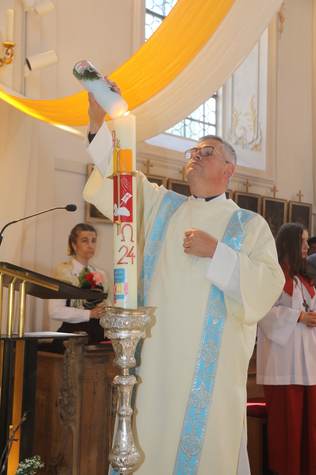 Zu Beginn der Wallfahrtswortgottesdienstfeier segnete Diakon Christian Pastötter die mitgebrachte Kerze der Grünbacher Trachtler die anschließend an der Osterkerze entzündet wurde
