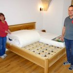 Fotos: Hötzelsperger – 1. Andrea und Peter Kurz in ihrem Schlafsystem-Ausstellungsraum – 2. Peter Kurz in seiner Werkstatt, u.a. mit einer neuen Lochplattenpresse für den Bettenbau.