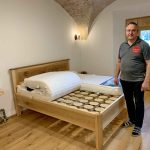 Seit dem Jahr 2017 hat sich Peter Kurz dem Schlafsystem RELAX 2000 verstärkt gewidmet, dazu hat er in seinem stattlichen Werkstatt-Gebäude einen eigenen Muster-Raum hergerichtet. Der Raum mit altem Stallgewölbe zeigt Schlafmöbel und viele Dinge, die zu einem wohltuenden Schlaf beitragen. „Anfangs waren Schlafmöbel eine Nische, doch dann stieg die Nachfrage nach Naturholzbetten, die komplett stahlfrei sind, da haben wir uns mit einem Hersteller aus dem Salzburger Land zusammengetan, der auf mich und meine Frau Andrea zukam“ – so Peter Kurz, Jahrgang 1963. Wie der stellvertretende Obmann der Schreiner-Innung Rosenheim weiter erklärt, werden die Holzteller (3 D-Spezialfederkörper für perfekte Körperanpassung) von einer Behinderten-Einrichtung im Berchtesgadener Land erstellt. Passend zum Möbelstück werden reine Natur-Latex-Matrazen angeboten. Neuerdings gibt es mit den gleichen Naturmaterialien (Zirbe, Weißbuche und Kautschuk) für Babys eine Wippe mit ergonomischer Liegefläche, dazu Peter Kurz, der auch vereidigter Sachverständiger für die IHK Oberbayern ist: „Diese Babywelle wurde von Dr. med. Johannes Michel, einem Kinderchirurgen aus München eigens entwickelt“.