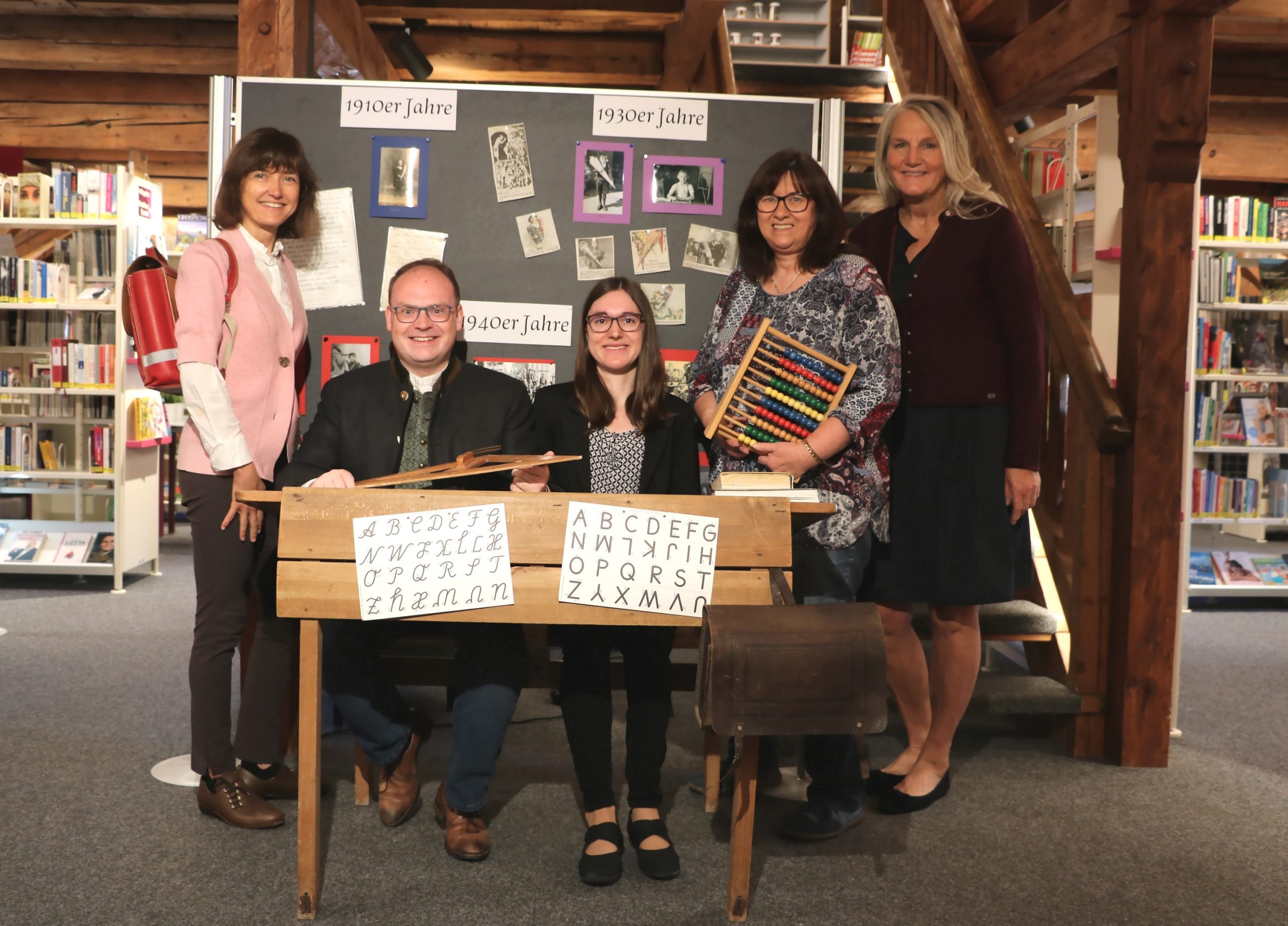 Die Schulstartwoche in der Bücherei Prien ist eröffnet: Die Geschäftsführerin der Prien Marketing GmbH Andrea Hübner (Jahrgang 1986), der Erste Bürgermeister der Marktgemeinde Andreas Friedrich (Jahrgang 1994), die Büchereileiterin Melanie Schieber (Jahrgang 2002) und ihre Kolleginnen Uschi Ziegler (Jahrgang 1966) und Moni Zech (Jahrgang 1970) erinnern sich gerne an ihren ersten Schultag.