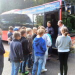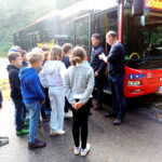 Die Schüler stellten viele Fragen. Besonders kam diesmal das leidige Thema „Schubsen“ zur Sprache, das zu gefährlichen Situationen sowohl beim Warten draußen als auch im Bus selbst führen kann. Obinger sagte, dass es beim Drängeln und Schubsen nur Verlierer geben könne und sicher niemand schneller ans Ziel komme. Wichtig sei geordnetes Ein- und Aussteigen und das Festhalten beim Fahren, besser noch Sitzen. Bei den Haltegriffen handle es sich keinesfalls um Turngeräte. Interessiert beobachteten die Schüler, wie die Rampe für Rollstuhlfahrer oder Personen mit Kinderwägen ausgefahren wird, so dass auch Personen mit Handicap mit dem Bus befördert werden können. Frohwieser forderte die Kinder auf, einen Blick dafür zu entwickeln, welche Mitfahrer/innen Hilfe benötigen. Zum Beispiel könnten sie ihnen anbieten, durch Drücken auf die richtigen Knöpfe dem Fahrer zu signalisieren, bitte anzuhalten. Schnell könnten sie selbst mal – zum Beispiel mit einem eingegipsten Bein – solche Hilfe benötigen.
