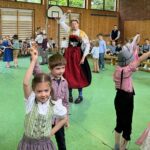Vom Trachtenverein Hinterskirchen stellten sich die Jugendleiter Veronika Hetzel und Mario Zänker und der Trachtenvorstand Sebastian Obermeier vor. Veronika und Mario übten mit allen Kindern der Schule an zwei Vormittagen die Volkstänze ein. Wast begleitete die Tänzer mit seiner „Ziach“. Veronika beschrieb ihre traditionelle niederbayerische Bauerntracht und die vielen Aktivitäten des Vereins wie Goaslschnoizen, Theaterspielen, Musik- und Gesangsgruppen und Volkstanz. Besondere Erlebnisse im Vereinsleben waren die Teilnahme an den Olympischen Spielen in Montreal und die Reise nach Rom zum 85. Geburtstag von Papst Benedikt. Veronika betonte, dass die Verbundenheit zur Heimat und das Kennenlernen des Brauchtums für die Kinder auch in der heutigen Zeit wichtig ist. Der Verein würde sich sehr über neue Mitglieder freuen. Nach einer Tanzeinlage von Vroni und Mario starteten die Aufführungen der Kinder.