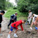 An einer weiteren Station direkt am Wasser, arbeiten die Kinder eifrig mit Schaufel und Hacke an der Kiesbank, um einen vom Menschen begradigten Miniaturfluss anzulegen und einen natürlichen Bachlauf, wie er in der Natur vorkommt. Begleitend erläutert Christa, Jugendleiterin des Vereins, welche Vorzüge der natürliche Bachlauf für die Tiere in und am Wasser bietet.