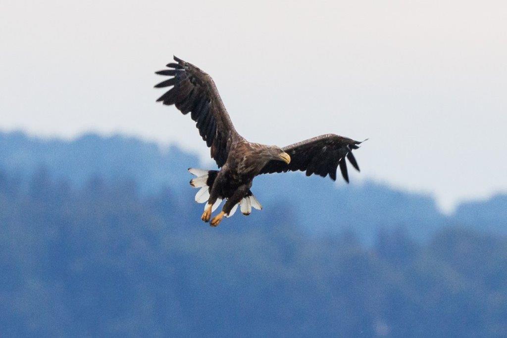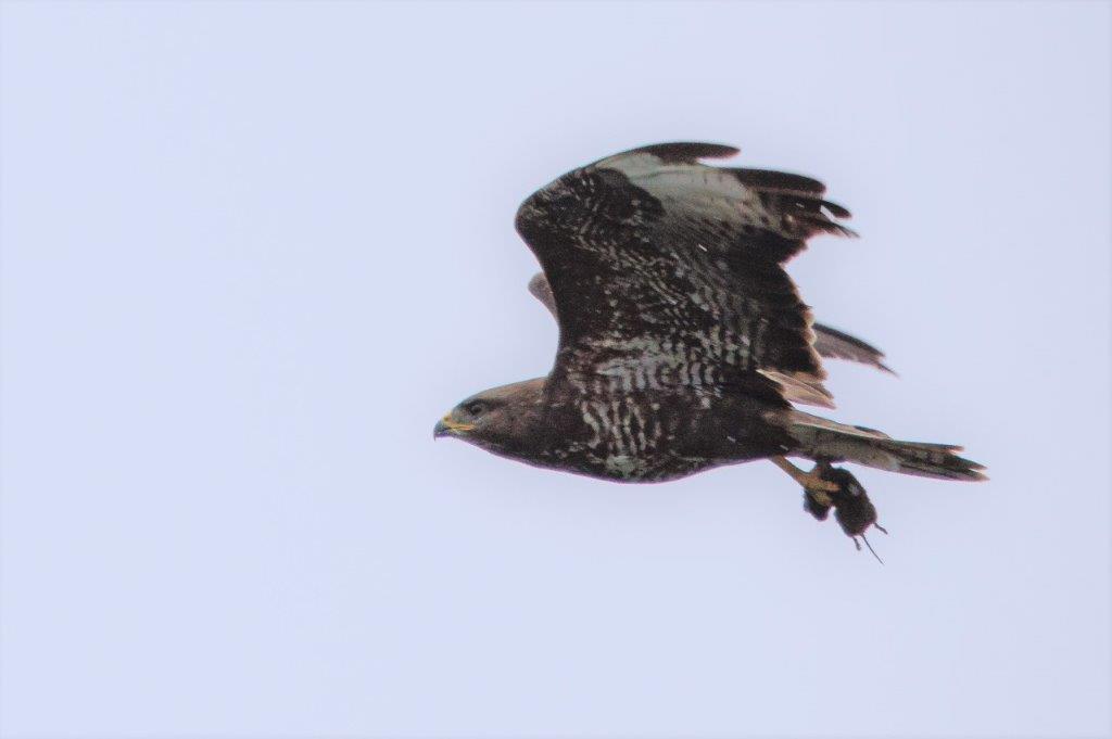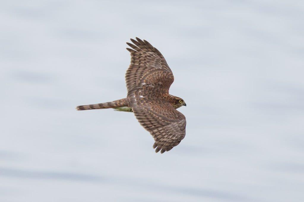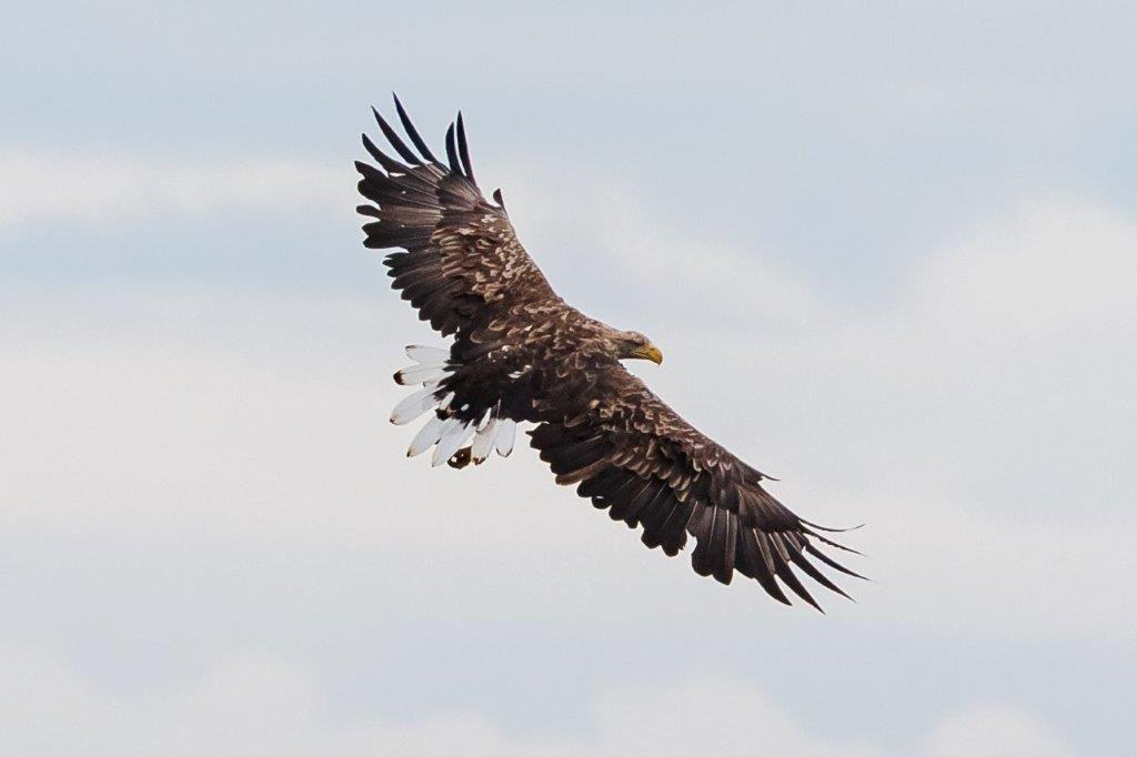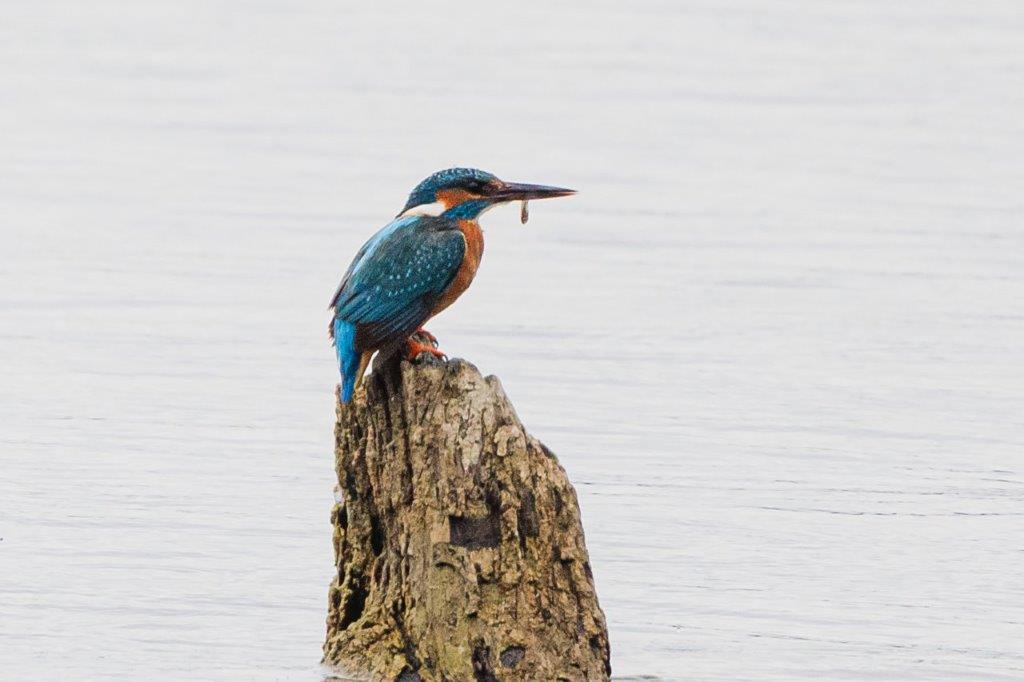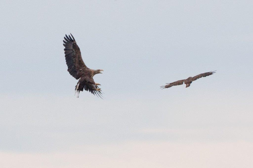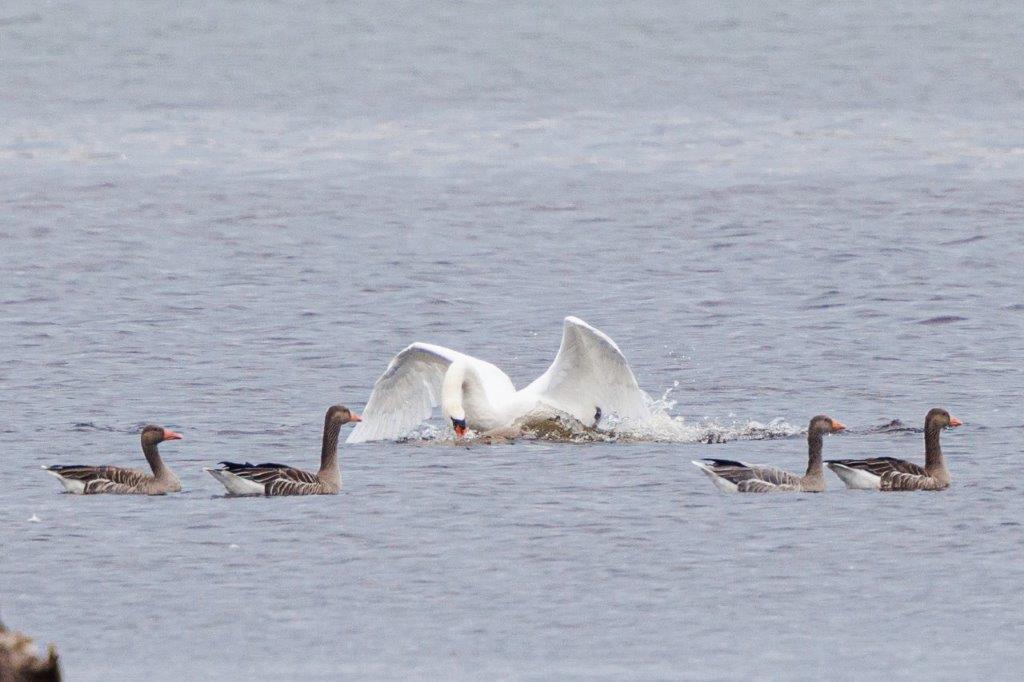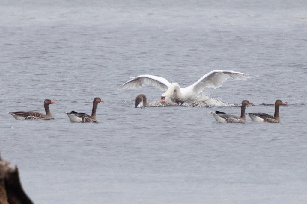 Nachdem sich die Regenschauer mit gelegentlichem Donnergrollen nach Osten verzogen hatten, jagte ein ungewöhnlich gefärbter Sperber über das Seerosenfeld. Ein Mäusebussard flog mit einer Maus in den Fängen vermutlich zum Horst. Flüchtende Graugänse und zahlreiche Kiebitze kündigten den Seeadler bei seinen erfolglosen Jagdversuchen in der Bucht an. Der plötzlich auftauchende Mäusebussard attackierte den Adler bei seinem Abstreichen in das Mündungsdelta der Achen. Große Kiebitzschwärme ließen sich dann wieder auf der schmalen Landzunge in der Bucht nieder. Ein Revierstreit war wohl die Ursache für das aufgeregte Rufen mehrerer Kleiber rund um den Turm. Ein Höckerschwanmännchen taucht wiederholt einen wohl fremden Jungschwan minutenlang unter Wasser, was der kleine Schwan aber überlebte und heftig flügelnd das Weite suchte. Entspannter war dann noch die erfolgreiche Jagd eines EisvogelMännchens zu beobachten.
