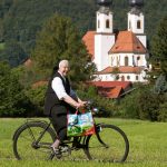 5_Sr. Berlinde als Fotomodell für die Aschauer Tourist Info_Foto Berger: Sr. Berlinde mit Aschau-Tasche flott auf dem Fahrrad unterwegs vor der Aschauer Pfarrkirche „Darstellung des Herrn“