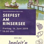Ein Seefest am Rinser See veranstaltet der Trachtenverein Prutting am Freitag, 14. Juni – mit der Innleit´n-Musi, bei jedem Wetter, mit Steckerlfischen und Grill-Brotzeiten, mit Flötzinger-Märzen und Hüpfburg sowie mit Auftritten der Trachtenjugend, der Aktiven und der Goaßlschnalzer. Der Ort: Seeleiten 1 in 83569 Vogtareuth.