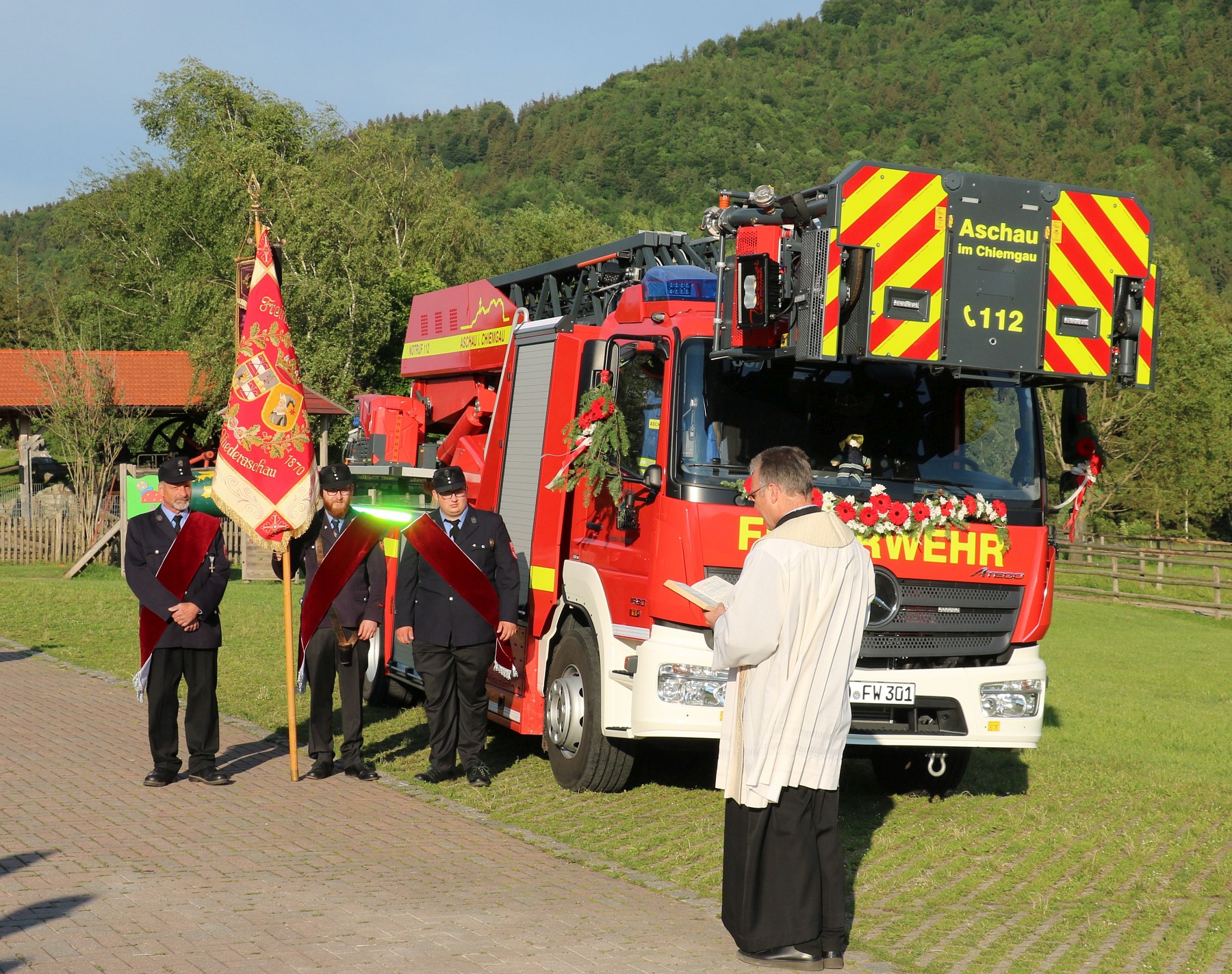 „Allzeit gute Fahrt, Gottes Segen und eine gute Heimkehr für alle nach jedem Einsatz“! wünschte Pfarrer Paul Janßen allen Aschauer Feuerwehrleuten und segnete nach der Gedenkandacht für die verstorbenen Mitglieder der Feuerwehr in Höhenberg das Drehleiterfahrzeug DLK 23/12.