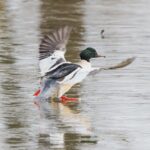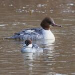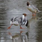 Auf einem kleinen Eisrest im Weiher in der Feldwieser Bucht schlitterten Gänsesäger wie Schlittschuhläufer über die nasse Eisbahn, die schon am nächsten Tag verschwunden war. Ein Zwergsägerweibchen, ein Wintergast aus dem Norden, fischte einträchtig mit der großen Verwandten, das Gänsesägerweibchen.
