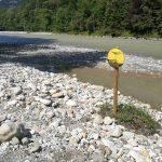 Hinweisschilder, wie im Bild zu sehen, weisen auf das Vorkommen von Kiesbrütern auf den jeweiligen Kiesbänken hin. Es wird gebeten, das Gebiet nicht zu betreten.