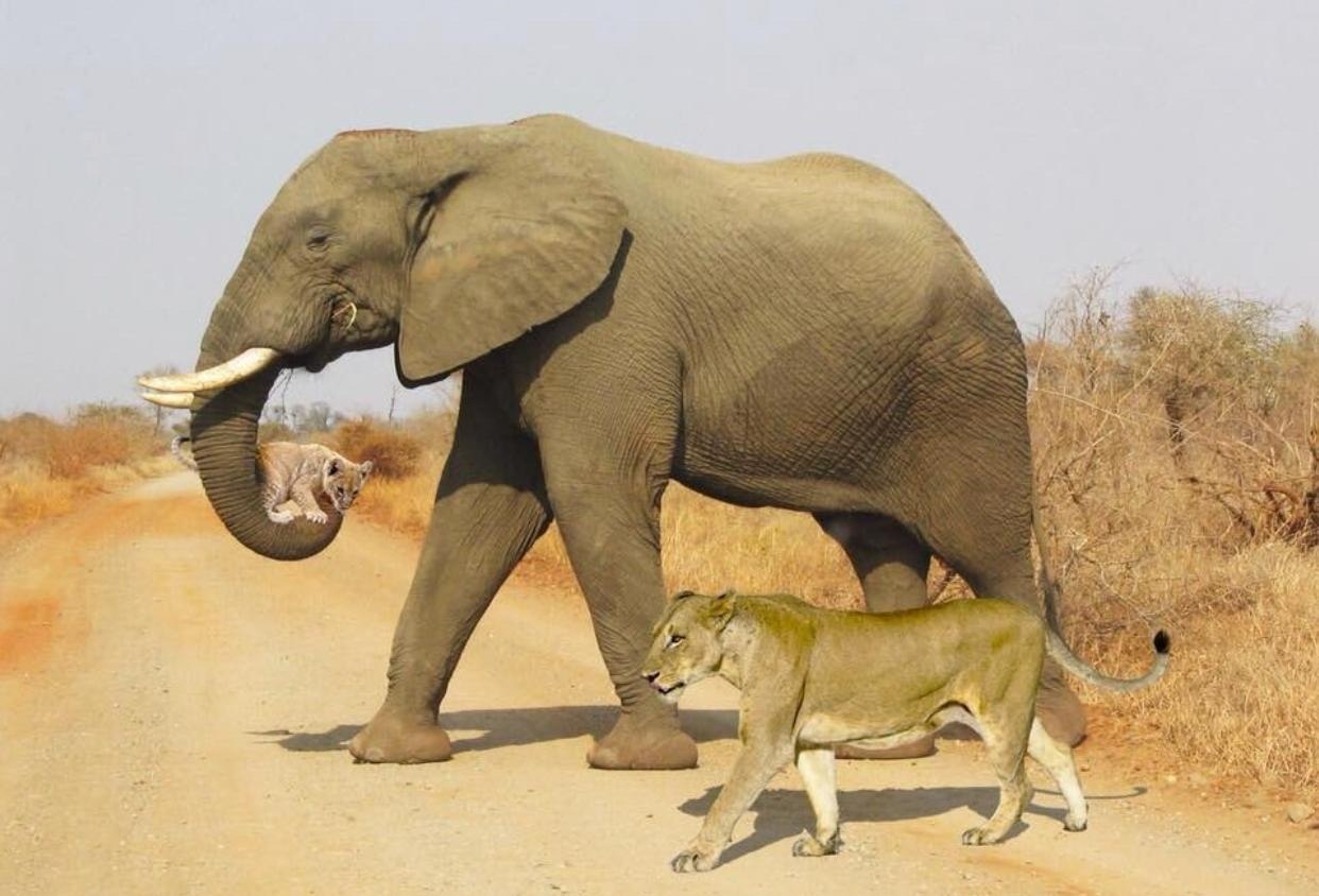 Text zum Bild: Das ist eines der schönsten Fotos dieses Jahrhunderts: Eine Löwin und ihr Junges befanden sich in der Savanne. Es war so extrem heiß, dass das Löwenbaby starke Schwierigkeiten hatte sich fortzubewegen. Ein Elefant bemerkte das, nahm das Junge mit seinem Rüssel auf und trug es bis zu einer Wasserstelle während die Löwenmutter nebenherging.