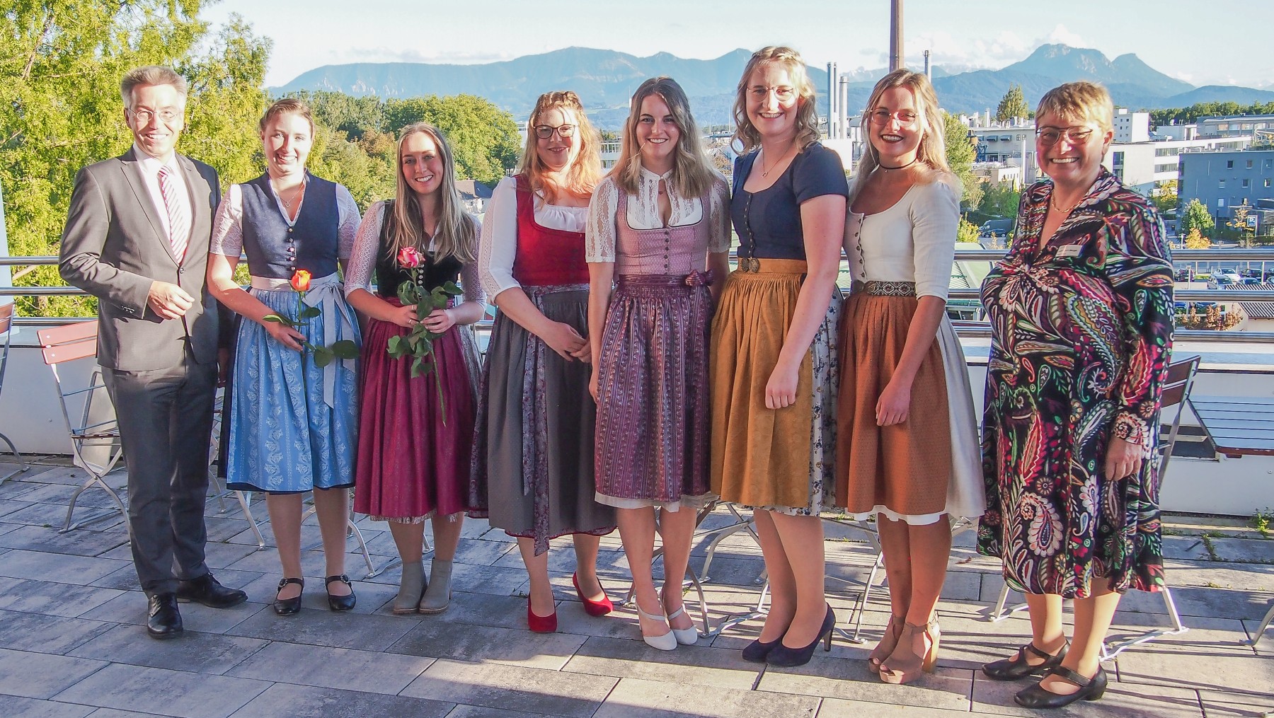 Die erfolgreichen Staatspreisträgerinnen (v.l.n.r.) Christina Fritz, Marina Huber, Theresa Huber, Hanna Dinner, Magdalena Hanslmaier und Theresa Friedrich (leider nicht auf dem Bild: David Welser) mit Landrat Otto Lederer (li.) und RoMed-Pflegedirektorin Judith Hantl-Merget (re.)