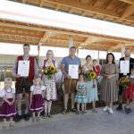 Foto: Giulia Iannicelli/StMELF – zeigt v.l.: Familie Himmelstoß (Lkr. Cham), Familie Leonbacher (Lkr. Fürstenfeldbruck), Ministerin Michaela Kaniber und Familie Grandl (Lkr. Freising).