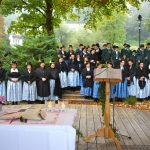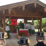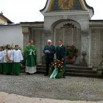 Nach einem feinen musikalischen Einzug zu den Klängen der Musikkapelle unter der Leitung von Wolfgang Haiker, die auch die Messe gestaltete, freute sich Pfarrer Thomas von Rechberg über den schönen Platz für einen Gottesdienst in freier Natur und die vielen festlich gekleideten Menschen. „In der Natur ist man ein Stück näher bei Gott“ gab der geistliche persönliche Erlebnisse preis und nutzte das Evangelium für einen Vergleich mit den Menschen unserer Zeit. „Jeder von uns ist von Gott berufen die Gebote der Schöpfungsordnung einzuhalten, nutzen wir unsere Möglichkeiten, in die Beziehung zu Gott und den Mitmenschen einzutreten“, ermunterte er die Gläubigen und beteuerte: „Frohes Leben und Feiern ist zutiefst menschlich und gehört dazu“. Mit einem Lob für die Trachtenvereine, bei denen Zusammenhalt und Hilfe ein Markenzeichen seien, setzte er den Schlusspunkt unter einen Gottesdienst, bei dem Franz Krammer und Petra Holzner die Lesungen und die Fürbitten vortrugen, und marschierte dann mit seinem Kirchendienst und den Trachtlern durch das Dorf hinauf zum Kirchplatz, wo die beiden Vorstände Sepp Geisreiter und Michael Mader gemeinsam einen Kranz vor dem Kriegerdenkmal ablegten.
