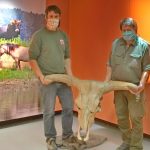 Bericht und Bilder: Franz Krammer – Die Bilder zeigen Museumsleiter Dr. Robert Darga (rechts) und Klaus Jakob aus dem Freilichtlabor Lauresheim beim Aufbau der Sonderausstellung mit einem der seltenen Fundstücke eines Auerochsen-Schädels.