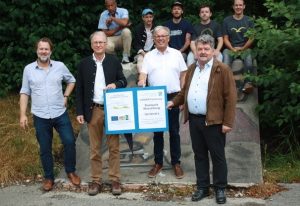Von links: Christian Fechter, Manager der LAG Chiemgauer-Seenplatte; Dr. Georg Kasberger vom Amt für Ernährung, Landwirtschaft und Forsten Rosenheim, Michael Kölbl, 1. Bürgermeister der Stadt Wasserburg; Sepp Reithmeier, Bürgermeister der Gemeinde Pittenhart und Vorsitzender der LAG Chiemgauer-Seenplatte, dahinter die Vertreter des Vereins „movinn forward“. Foto: Peter Rink