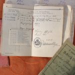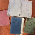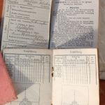Ausweispapiere aus dem großen Krieg, der Militärpass, das Schießbuch und ein Notizbuch mit der Aufzählung der Bahnhöfe auf irgendeinem Verlegungstransport zur Front